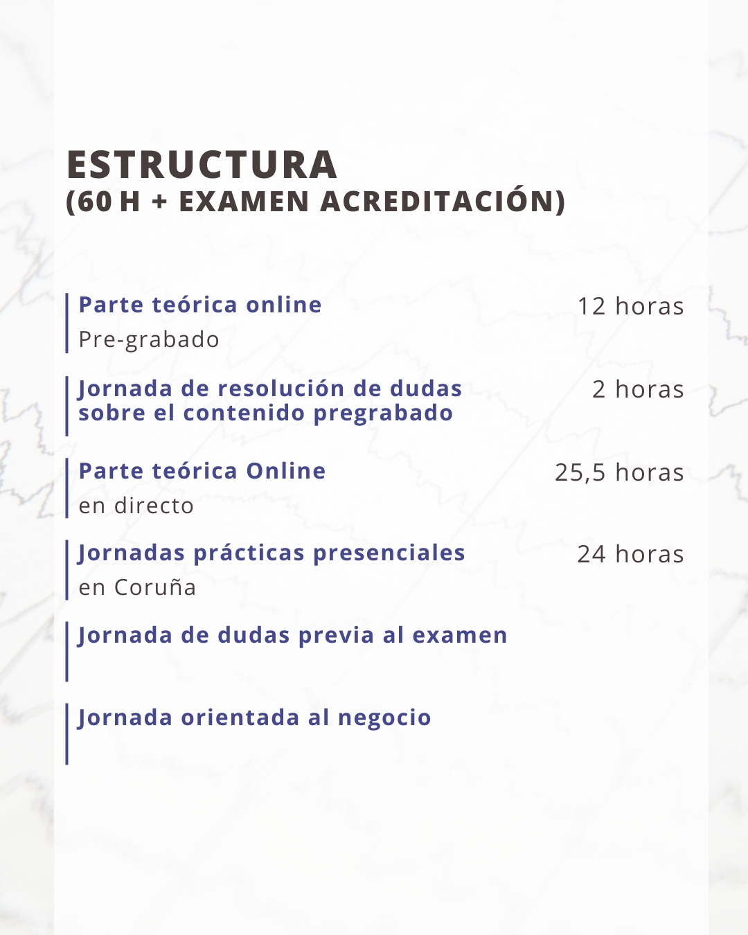 - Jornadas practicas presenciales en Coruña (24 horas impartidas viernes, sábado y domingo)