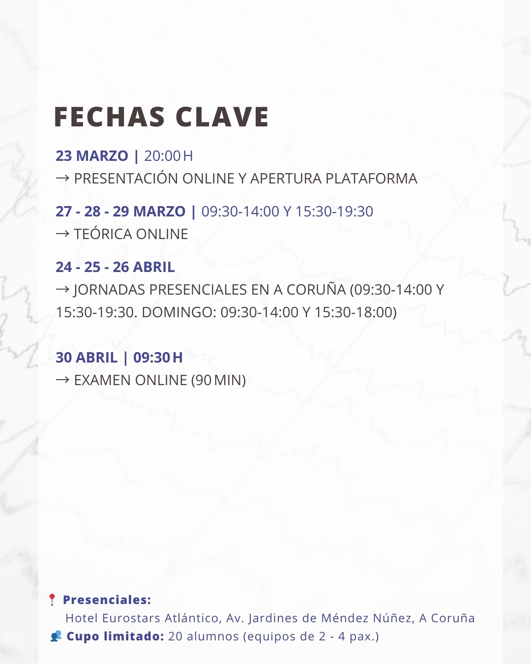 - 24, 25 y 26 de Abril del 2026: Jornadas presenciales en A Coruña viernes y sábado 09:30 a 14:00 y de 15:30 a 19:30 hora española y domingo de 09:30 a 14:00 y de 15:30 a 18:00 hora española. (*) (**)