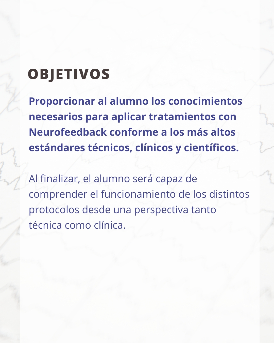 La meta de este curso de Básico de Aplicación Clínica del Neurofeedback es que el alumno pueda entender y aplicar los conocimientos requeridos para la realización de un tratamiento con Neurofeedback que cumpla con los más altos estándares técnicos, clínicos y científicos.